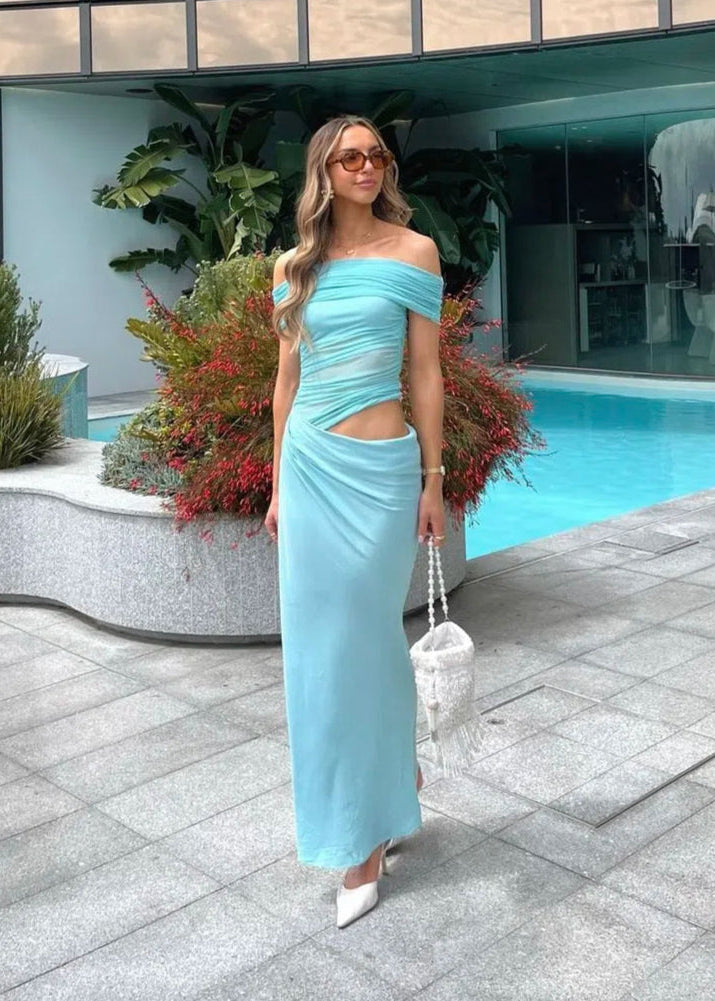 Meet the Nico in Aquamarine, Benni's most viral dress featuring an off-shoulder design and flattering cowl on the left side waist. The overlapping skirt and mesh bodice creates depth, with the option to show more skin on the wearer's left hand side waist.