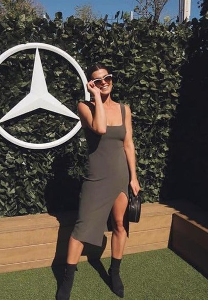 Sleek and stylish, this elegant dress by Bec & Bridge features a square neckline, sleeveless design and midi silhouette. The thigh-high front split completes this timeless staple.