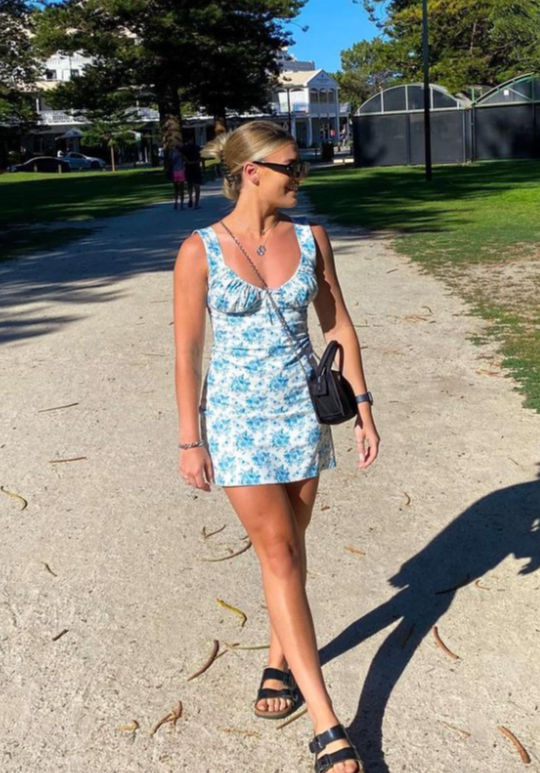 The Cher Dress is an a-line mini dress with a sweetheart neckline, cupped bust and a small ribbon detail featuring an elasticated bust and back.