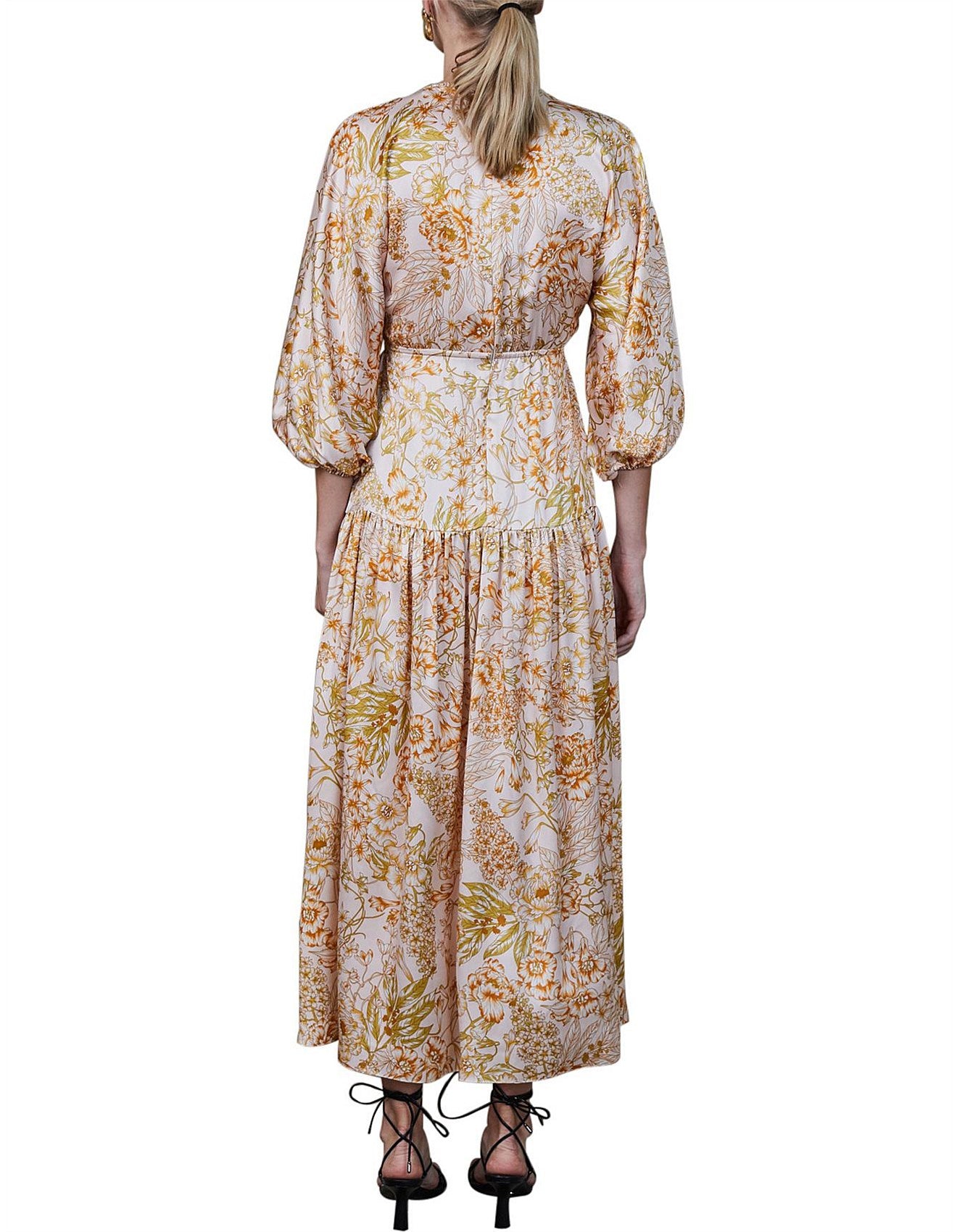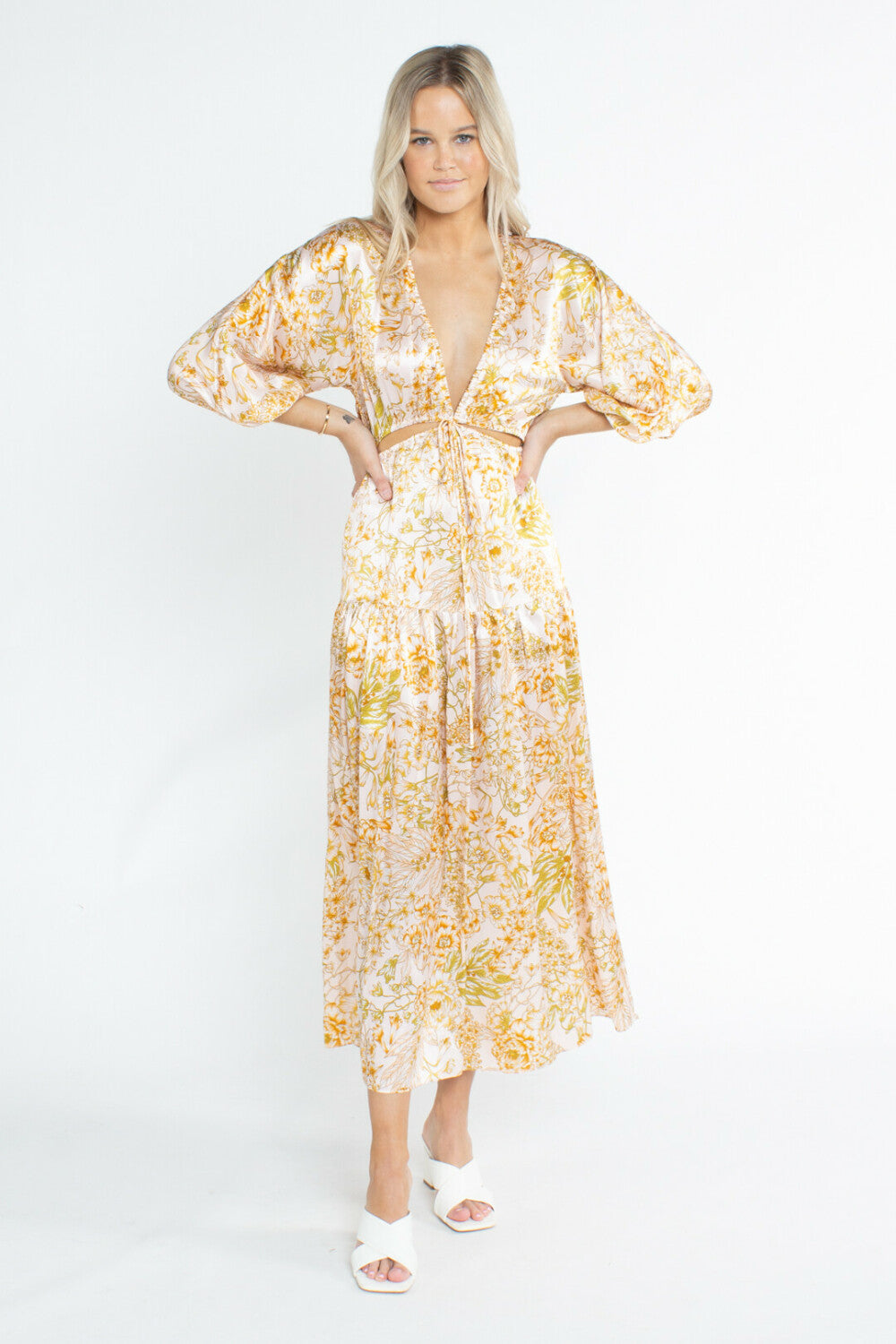 This beautiful silk midi dress is the perfect piece for your next special occasion or event. Made from a feminine floral print and featuring a gathered skirt and rouleau tie under the bust cut out to give it a modern edge. Pair with nude heels, statement earrings and soft curls or a pair of your favourite summer sandals for a more low key setting.