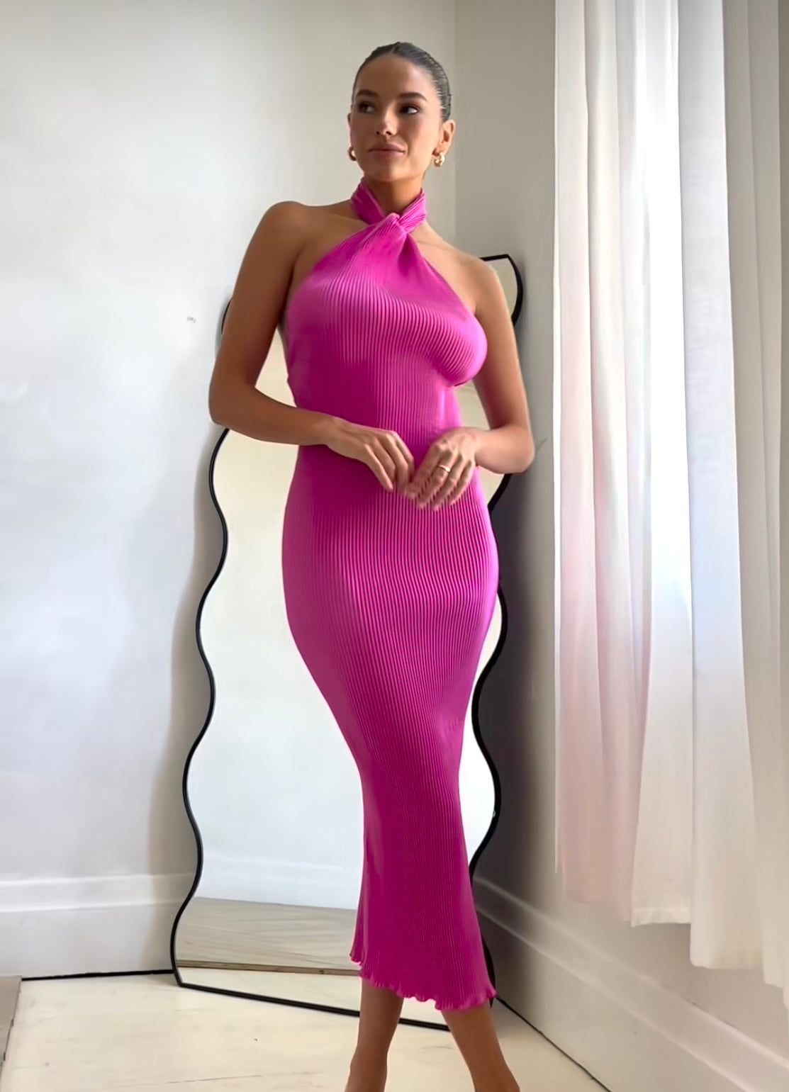 With its flattering halter neckline, backless design and finely ribbed pleats, the L'IDÉE Klum Gown accentuates is the style of the season. Featuring signature ribbed pleating through the torso which softens into a pleat and finishes with a gently fluted hem.